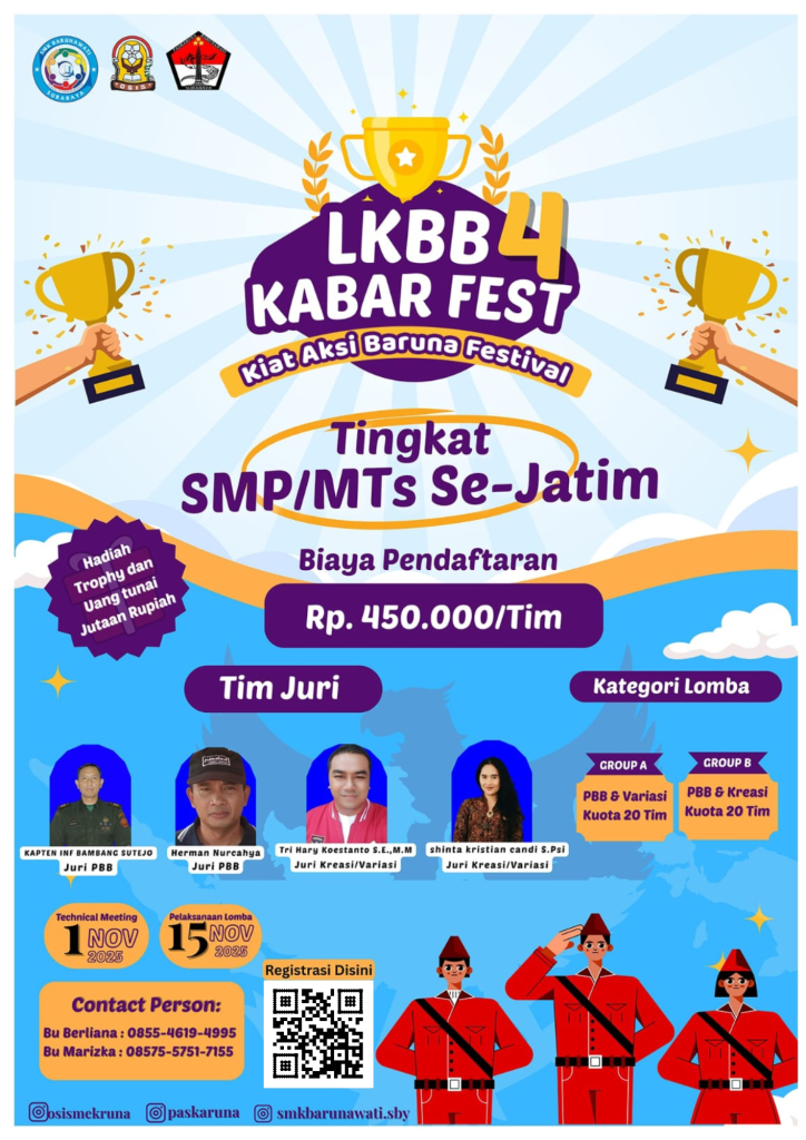 Untuk informasi pendaftaran lebih lanjut, pantau terus media sosial resmi SMK Barunawati Surabaya! Sampai jumpa di lapangan, tunjukkan aksimu!